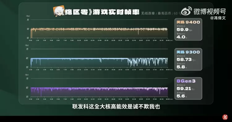 在负载更高的《崩坏:星穹铁道》测试中,天玑9300和8G3平均帧率只有40帧左右,天玑9400直接接近满帧。可以说,天玑9400把这三款重载游戏直接征服了。