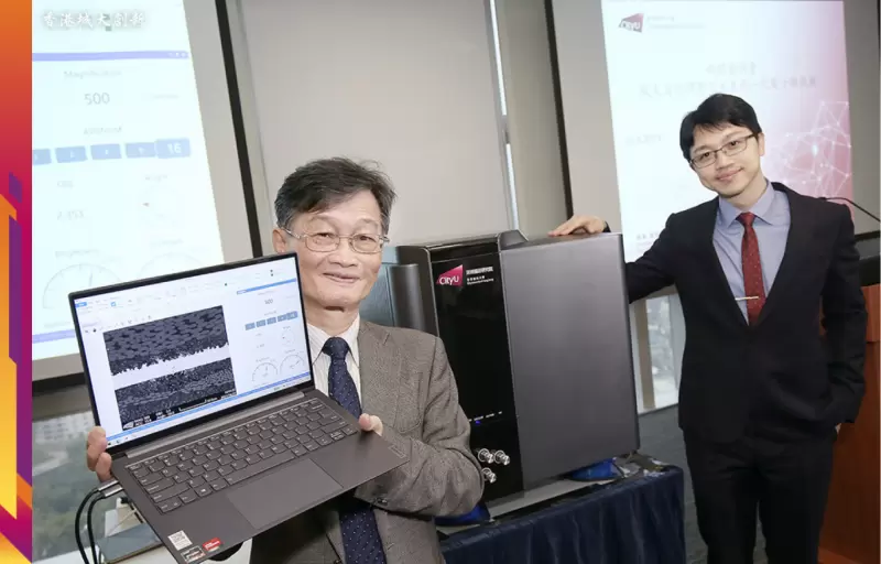 陈福荣教授(左)为电子显微镜研究领域的翘楚,他与团队成员薛又峻教授(右)于去年4月分享了他们在“高时间分辨电子显微镜”研究的最新成果及突破。(图片来源:香港城市大学)