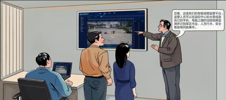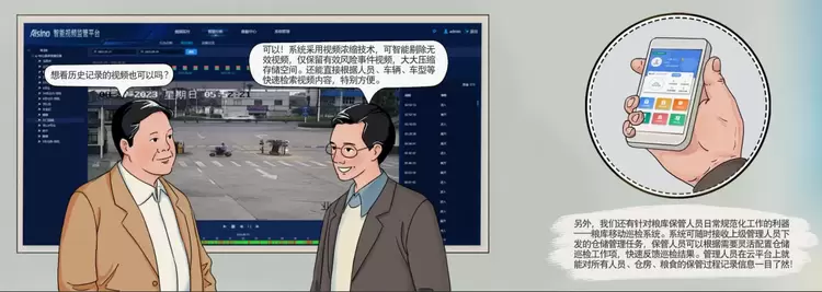 在粮库的监控室内,李主任介绍了智能视频监管平台:“监管人员可以在监控中心的大屏或是自己的手机、电脑上随时远程视频监控并识别库区作业、人员行为、安全着装等风险事件。”