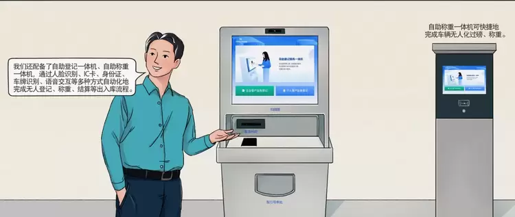 工作人员还展示了自助登记一体机、自助称重一体机。设备可通过人脸识别、IC卡、身份证、车牌识别、语音交互等多种方式自助完成无人登记、称重、结算等出入库流程。