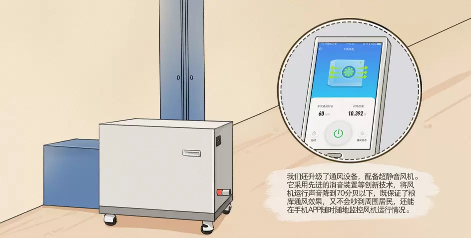 粮库还升级了通风设备,配置超静音风机。它采用先进的消音装置等创新技术,将风机运行声音降到70分贝以下,既保证了粮库通风效果,又不会吵到周围居民,还能在手机APP随时随地监控风机运行情况。