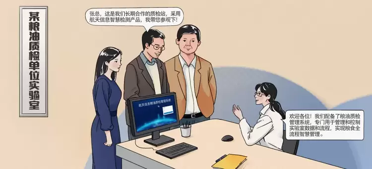 李主任又带领张总到粮库长期合作的质检站,了解智慧检测产品——粮油质检管理系统。该系统专门用于管理和控制实验室数据和流程,实现粮食全流程智慧管理。