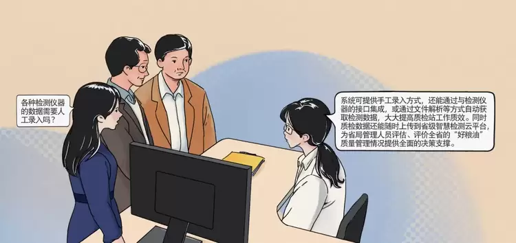 工作人员介绍,系统可提供手工录入方式,还能通过与检测仪器的接口集成,或通过文件解析等方式自动获取检测数据,大大提高质检站工作质效。同时,质检数据还能随时上传到省级智慧检测云平台,为省局管理人员评估、评价全省的“好粮油”质量管理情况提供全面的决策支撑。