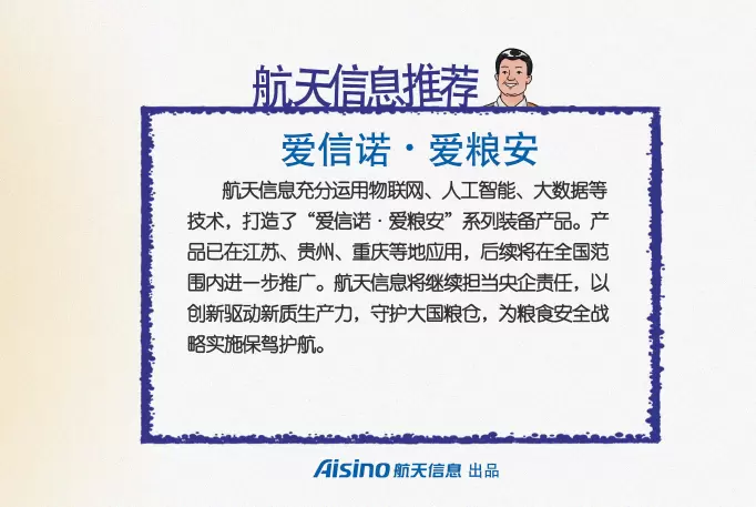 粮食信息化是保障国家粮食安全的重要支撑。航天信息股份有限公司“爱信诺·爱粮安”系列装备产品,应用数字化、智能化手段解决行业痛点,助力强化粮食行业监管力度、提高仓储作业效率、提升储粮品质,为保障粮食安全提供有力的科技支撑。