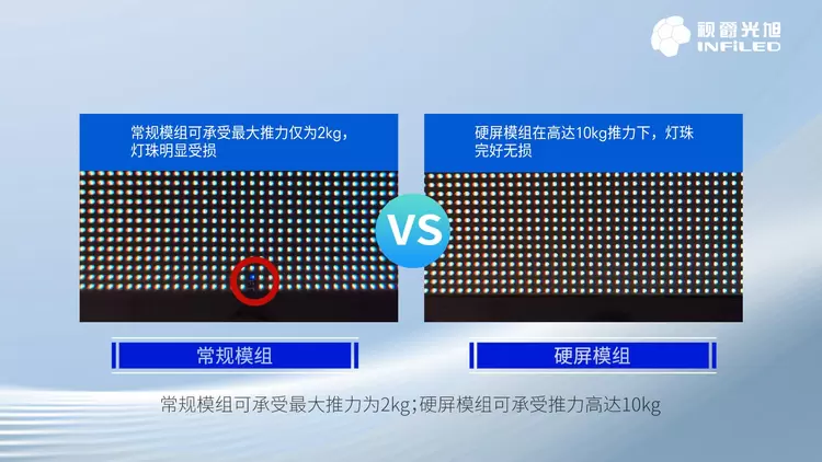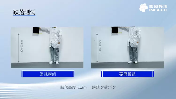 将两个模组从1.2米同一高度各跌落四次,经测试,常规模组有23个LED灯珠失效,硬屏模组完好无损。