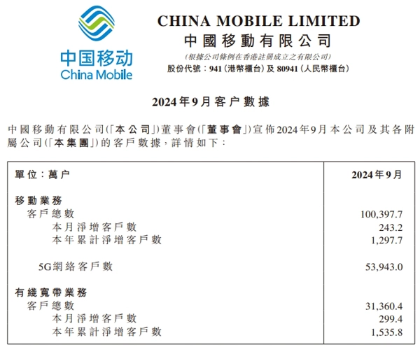 数据显示,2024年9月份,中国移动用户总数达到10.03977亿户,当月净增客户数243.2万户。有线宽带方面,中国移动有线宽带客户总数达到3.13604亿户,当月净增客户数299.4万户。