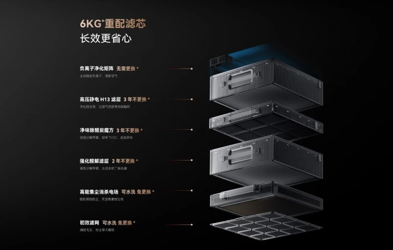 针对频繁更换滤网的困扰,X5所采用的炭魔方滤网3年不用换,降低耗材成本。此外利用RFID智能滤芯识别,自动监测精准管理滤芯寿命及提醒更换养护,用户可及时得知各滤芯使用情况,实现分区管理。开启智能托管后,X5可根据空气质量智能调整净化模式,无感运行智能省心。