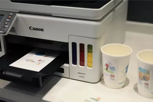 佳能恭喜系列商喷打印机GX6080携手Nicely咖啡,将独特的“咖啡哲学”印制成防水杯贴传递给客人