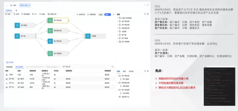 此外,白泽还加载了数据模型强大的计算能力。它在面对包含时间计算的问句(如"2024年1月4日,所有客户的资产和负债金额,以及同比")时,无需大模型生成复杂的SQL,只要通过数据模型动态构建的包含"资产金额同比"、"负债金额同比"的单表,即可快速准确地完成查询,从而进一步降低大模型对于NL2SQL能力的依赖。