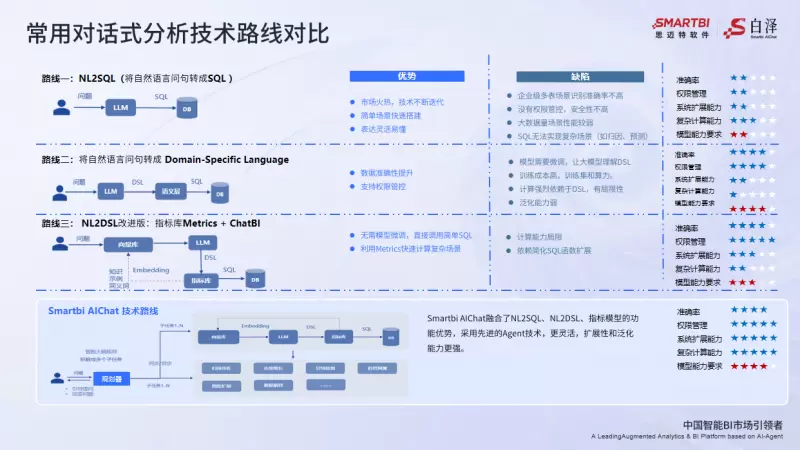 在对话式分析技术路线中,技术路线一(NL2SQL路线)在准确性、数据权限、指标口径、复杂分析、扩展性和灵活性方面存在局限性。技术路线二(NL2DSL路线)虽然改善了精准度和安全性,但因需单独微调和适配而导致巨大的工作量和成本,同时限制了泛化能力。