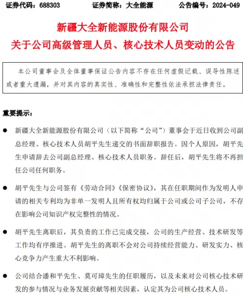 本来一位核心技术人员的变动,对于上市公司来说较为常见,即便叠加了副总经理的高管身份,也依然属于正常的人员变动范畴。但大全能源的上述消息一经公布,还是迅速引起外界关注和热议,其中就包括对胡平离职对大全能源技术研发的影响,以及对可能造成技术研发成果流失风险的担忧。
