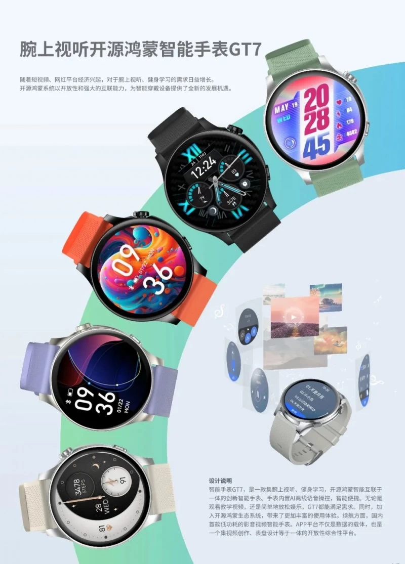 宜准GT7智能手表支持AMOLED 1670万炫酷色彩,具备音视频同步解码功能,能够播放多种音源格式,用户可将健身视频和音乐存储于手表中,极大提升了运动场景下的便利性。在通话方面,GT7支持1米距离拾音、回声抵消和智能降噪功能,提供卓越的通话效果。内置AI处理能力使得手表可以离线语音识别控制,基于神经网络训练的AI降风噪算法可抗4级风噪,即使在骑行中也能实现无压力通话。此外,通过OpenHarmony的XTS认证,GT7进一步整合了智能设备的生态体系。