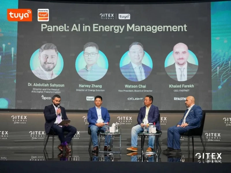 随后,涂鸦以“AI重塑能源管理”为主题举办了第二场圆桌论坛。APCO AI和数字化转型总监兼主管Dr. Abdullah Sahyoun作为主持人。活动中,涂鸦智能新能源系统解决方案总监张华、星光股份董事、副总裁柴华、FASTNET CEO Khaled Farekh等来自不同领域的行业领袖,共同围绕AI、能源、可持续发展等前沿论题展开了深入讨论,以助力全球开发者勘破商业前景。