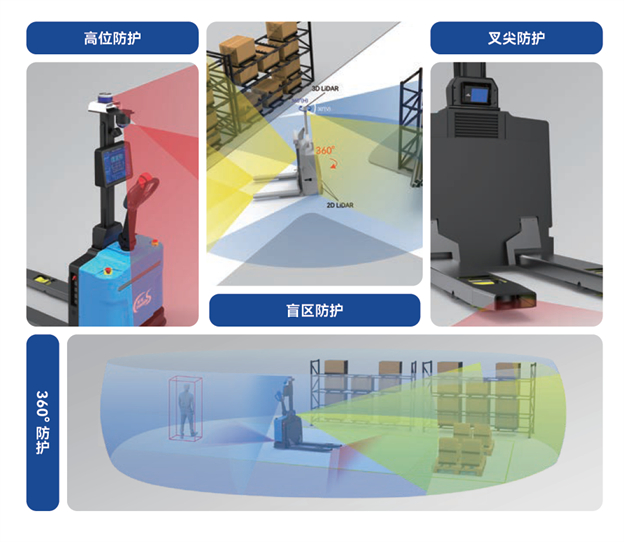 3、全方位安全防护:镭神智能机器人3D SLAM无人叉车最高配置7颗激光雷达,360°全方位覆盖确保了叉车在运行过程中的安全性。