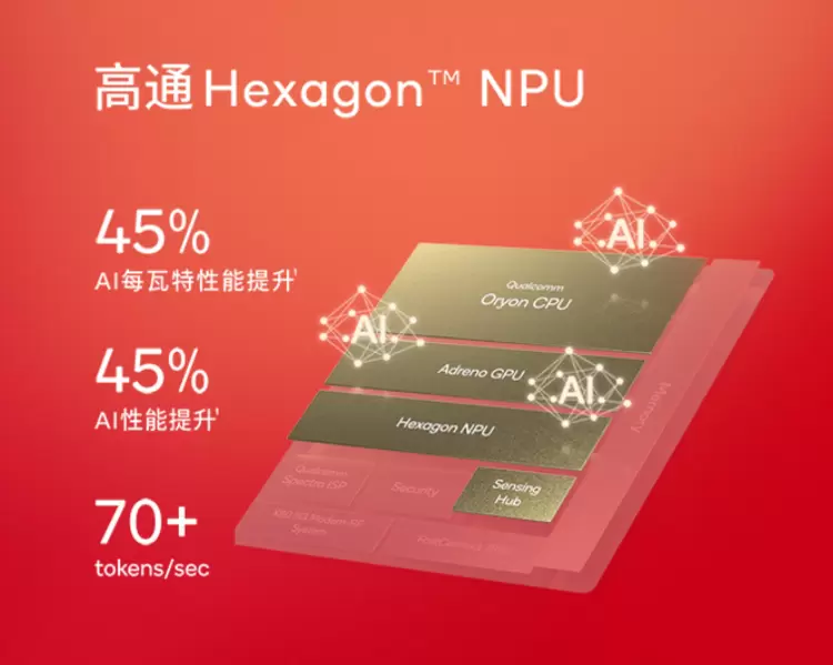 NPU方面,骁龙8至尊版搭载了Hexagon NPU。高通表示,其AI性能提升45%,单位功耗性能提升45%,新增支持端侧多模态AI助手和更快的Token输入。