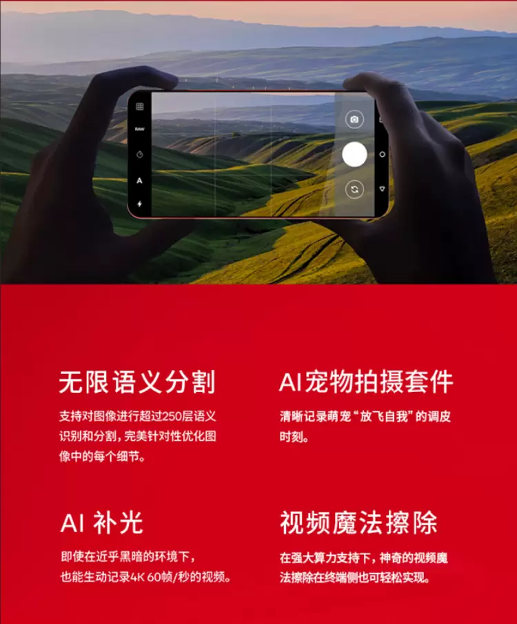 新芯片支持无限语义分割、AI宠物拍摄套件、AI补光和视频魔法擦除等实用功能。
