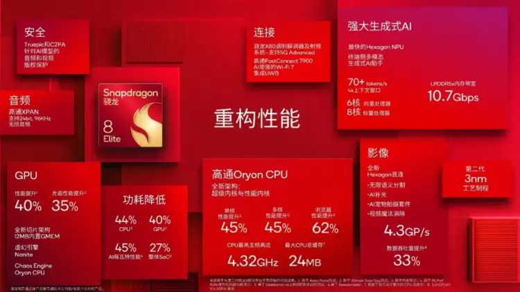 不只是全新命名那么简单,骁龙8至尊版配备了下一代定制高通Oryon CPU,在Adreno GPU、Hexagon NPU、Spectra ISP和骁龙X系列调制解调器之外,补齐了整个平台内部集成定制核心的最后一块拼图,全定制的内核将会使得各类型核心有着无缝的配合从而带来更强的性能。