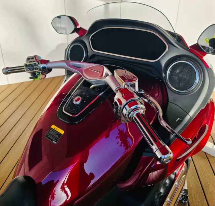 长城汽车这次空运过来即将发布的摩托车,是全球唯一一台2000毫升排量水平对置8缸发动机、配备8档DCT变速箱,搭载了骁龙8155芯片,配备了摩托车行业最大尺寸的12.3英寸LCD可触控仪表盘,支持OTA远程升级和语音助手等功能。