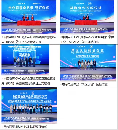 会议现场,中国电研CVC威凯与印度尼西亚国家标准局(BSN)、马来西亚电器分销商公会(MEADA)分别签署了合作谅解备忘录与战略合作协议。会上还举办了中国电研CVC威凯&印度尼西亚国家标准局(BSN)联合高端品质认证启动仪式以及电子电器产品“湾区认证”、马来西亚SIRIM PCS认证颁证仪式。通过与东南亚地区相关机构在认证认可领域的交流与合作,越来越多优秀的企业走出国门,为推动区域经贸合作和高质量发展做出了积极贡献。