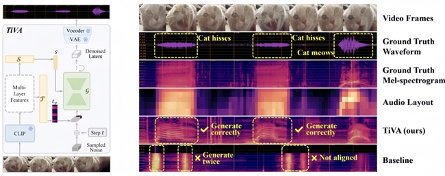 宋睿华具体阐释了TiVA的实现路径:通过新的音频信息表征形式Audio Layout,即极低分辨率的梅尔谱,来表示音频的粗粒度语义和时间信息。在一个无声视频中,可以先对其视觉语义进行编码并预测Audio Layout,然后利用语义编码和预测的Audio Layout作为条件信息,学习一个扩散模型生成音频。“各项客观和主观实验表明,我们的方法在生成质量、语义匹配和时间同步精度方面优于现有的SOTA方法。”宋睿华介绍。