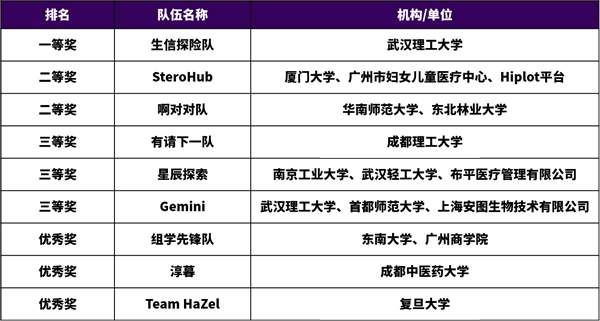 经过初赛、复赛的严格评审筛选,9支队伍脱颖而出进入本次的最后决战。经过激烈角逐决出最终结果:来自武汉理工大学的“生信探险队”荣获本次大赛一等奖,来自广州市妇女儿童医疗中心、厦门大学、华南师范大学、东北林业大学等高校或机构的队伍分别荣获二、三等奖和优秀奖。