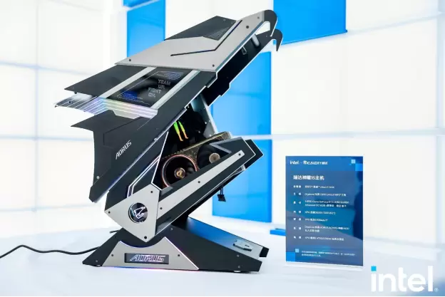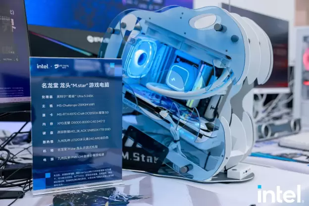 名龙堂“M.star”龙头开放式机箱氢蓝版搭载英特尔酷睿Ultra 5 245K处理器,这是和名龙堂LOGO一样造型的机箱,整体机械感十足,完全是一个性能怪兽。