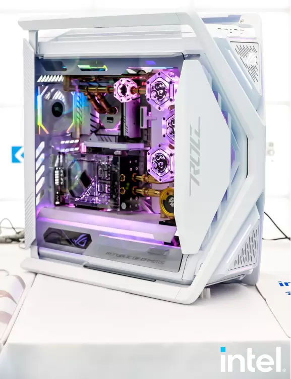 “创世神”分体液冷内部结构设计采用白色与金色的独特搭配。全天候工作,仍然确保了CPU在满载运转时保持低温,在多变的AI应用场景下,都能游刃有余,从容应对,将极致性能与低温运行完美结合。搭配ROG Z890 主板,内存频率高达9,000 MT/s。
