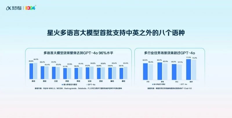 受限于海外市场规模小,语种分布碎片化,当前出口车型语音产品尚未接入大模型,座舱交互体验远不如国内车型。针对这一情况,科大讯飞董事长刘庆峰在本次发布会上带来了星火多语言大模型,在既有的中英文之外,新增了法语、德语、日语、韩语、俄语、阿拉伯语、西班牙语及葡萄牙语八种主要的国际语言,整体效果达到了GPT-4o 96%的水平,完全满足各类终端实际应用需求。