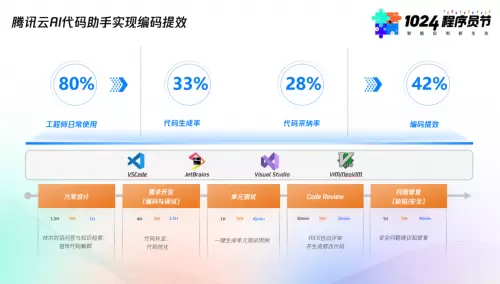 目前,腾讯内部已经有80%的程序员使用腾讯云AI代码助手实现开发提效,日均有33%的代码由AI生成,整体编码效率提升达到42%。刘毅表示,在腾讯内部某个核心需求开发过程中,通过活用腾讯云AI代码助手,将编码、调试、单元测试和代码评审的时间大大缩短,需求交付耗时缩短40%以上。在医疗业务开发项目中,研发团队通过应用腾讯云AI代码助手的技术对话、代码生成等能力,大幅缩短方案设计、需求开发、单元测试、代码评审、问题修复各环节开发时间,单个项目研发提效20%以上。