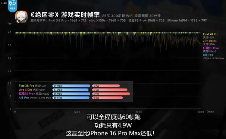 Find X8系列在媒体的游戏实测中展现了超强的性能和稳定性,即便在高亮、高温、高帧的极限场景下,Find X8 Pro依然能够满帧如一条直线,成为当之无愧的“满帧战神”。更值得一提的是,天玑9400不仅在性能上达到巅峰,低功耗表现也令人印象深刻。
