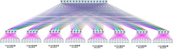 在网络架构确定之后,接下来是选择AI算力网络的硬件选型和组网方案。在组网硬件选型上,华为提供多种硬件组网方式,典型的有盒盒组网方案,盒框组网方案,框框组网方案。通过双方多次技术交流,综合B站机房现场环境条件、硬件成本等多方面考虑,B站选择盒盒组网的方案,如下图所示,构建的是一张千卡规模的AI算力集群。