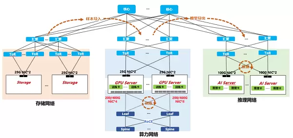 “样本导入——训练——模型导出——推理”等各个功能的子集群需置于同一张网络之中,形成一张庞大的算力网络;尽可能让数据和模型更快传输,让不同功能形成整体,实现业务层面的快。
