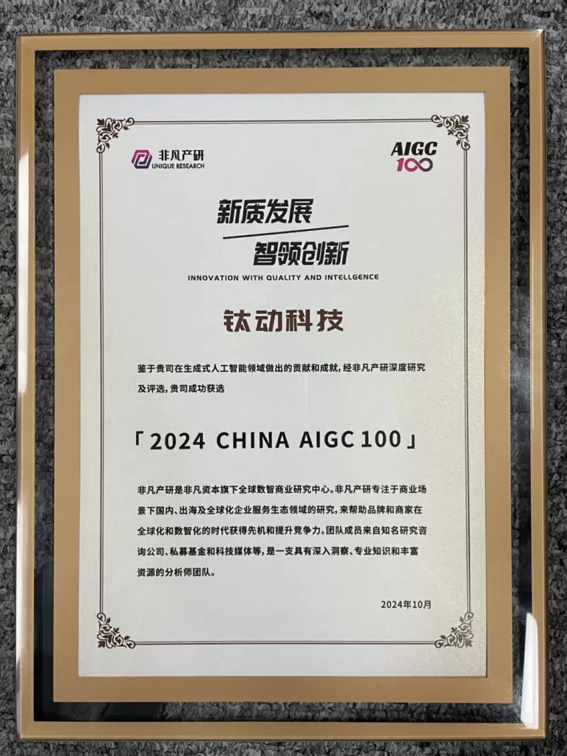 钛动科技荣耀入选2024 CHINA AIGC 100榜单,彰显AIGC应用领先实力