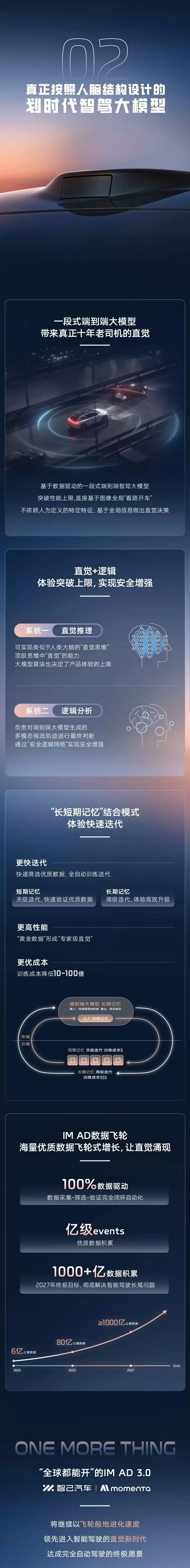 同时,“一段式端到端智驾大模型”拥有行业首创的“长短期记忆模式”独特架构,可实现更优的训练成本,大幅提升模型迭代速度,让产品获得“专家级直觉”。