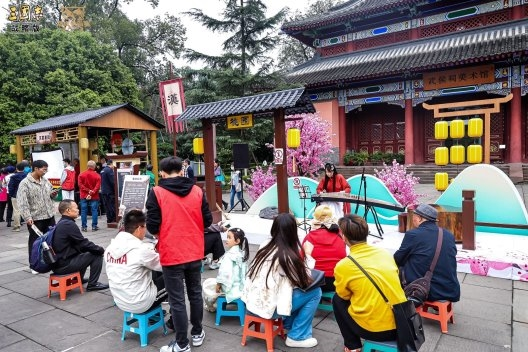 踏入武侯祠游园会,古意盎然的主舞台四周,分布了形形色色的三国文化和蜀文化体验区。体验区设计上巧妙结合了孔明先生的生平,从更多细节切面去呈现“鞠躬尽瘁”的武侯意志。例如“千人背诵出师表”的环节可以让人更有代入感的理解武侯北伐“兴复汉室”的初心以及“死而后已”的决心,而在聆听古琴表演的同时,参与者还可以通过现场的文字资料介绍了解到解武侯在“操琴”上的艺术成就。除此以外,玩家们还可以参与投壶互动等游戏,亲自体验一回古代蜀汉将士三军用命、秣马厉兵的感觉。