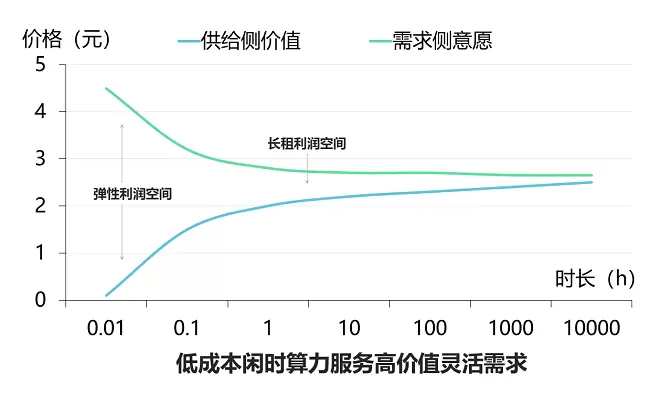 另一方面,从供给侧来看,为了规避断租停租的风险,当前新建算力中心主要以整租模式为主对外提供服务。少部分弹性灵活的服务价格往往又会是平常的数倍,部分小厂商虽然可以提供较为便宜的弹性算力服务,但实际仍是按时整租模式,受限于算力成本结构,商业上很难持续。从商业逻辑上来说,集中自建的算力中心并不适合满足短期、波动、零散的计算需求。