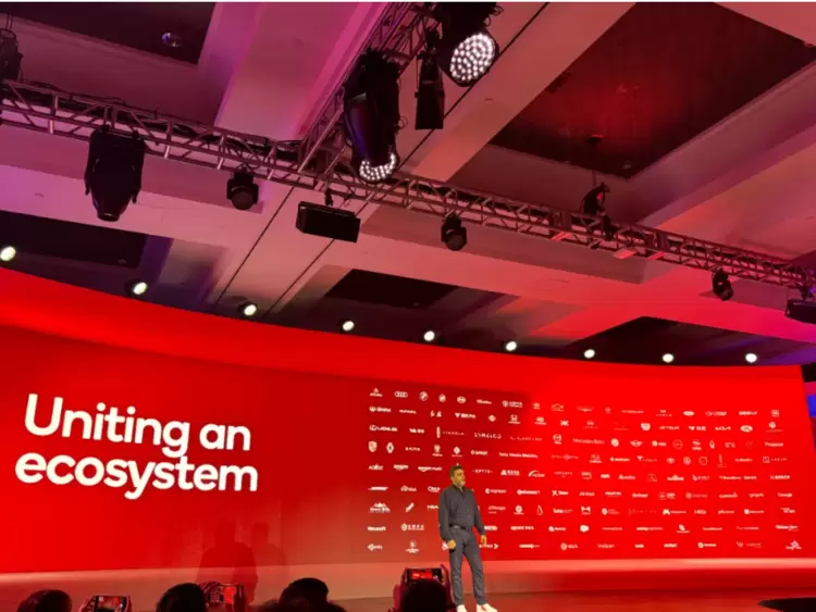 图为骁龙峰会2024第二天,高通技术公司汽车、行业解决方案和云事业群总经理Nakul Duggal现场展示高通骁龙的汽车生态伙伴