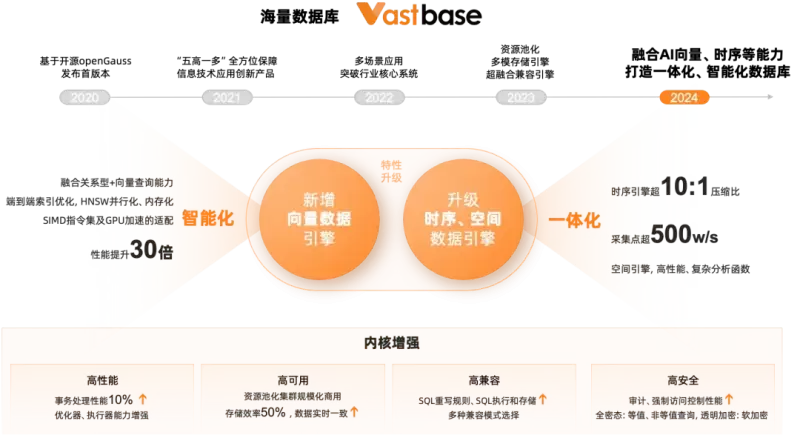 在产品方面,海量数据坚持走“一体化”和“智能化”路线。在一体化方面,Vastbase增强了时序引擎和空间引擎;在智能化方面,Vastbase融合关系型和向量查询的能力。