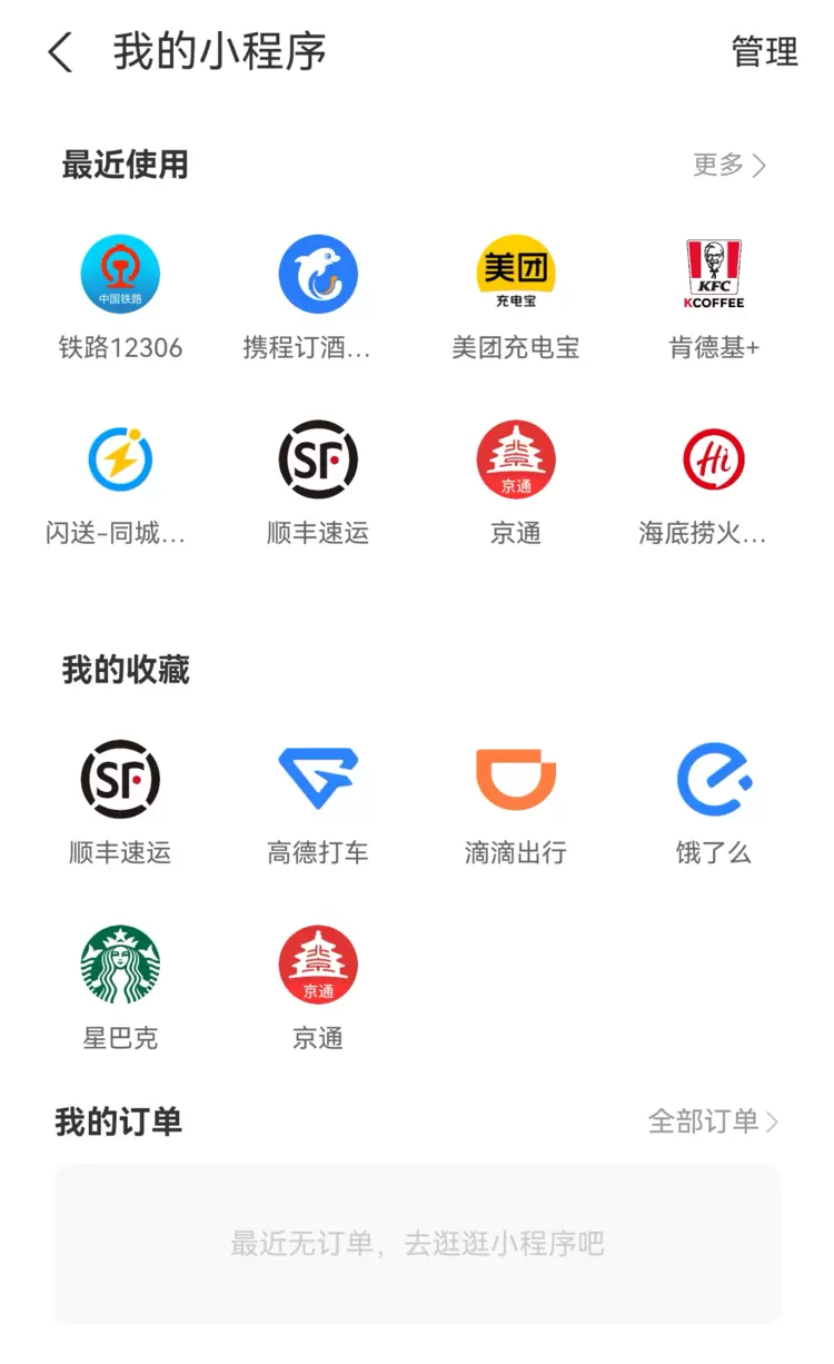 比如,我们可以通过支付宝中的饿了么小程序点餐,用星巴克小程序点咖啡,用滴滴、高德小程序打车,用淘票票小程序购买门票、电影票等等。同时,还可以把常用的小程序固定在“我的收藏”中,后续使用时无需搜索、一键直达。甚至用户在授权后还可以在支付宝中查看小程序订单信息,便捷度满分!