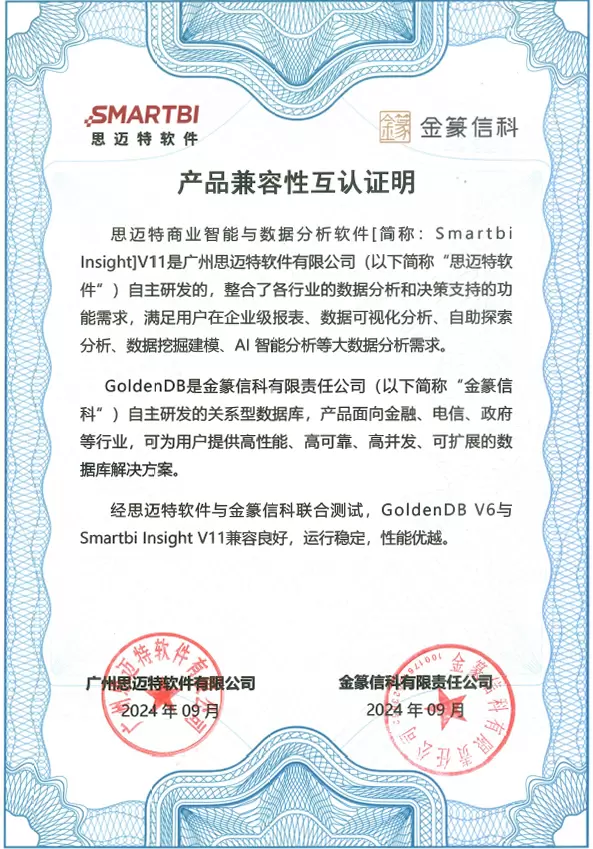 Smartbi Insight V11与金篆信科GoldenDB数据库实现产品兼容互认!