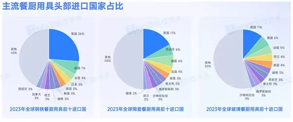 从进口市场来看,美国是全球最大的餐厨用具进口国,2023年美国在钢铁、陶瓷、玻璃餐厨用具的进口额在全球的占比分别达到26%、17%和11%。此外,欧洲国家如西班牙、德国、法国、英国和意大利等也是重要的进口国。与此同时,沙特阿拉伯在陶瓷、玻璃餐厨用具的进口上也有一定需求。