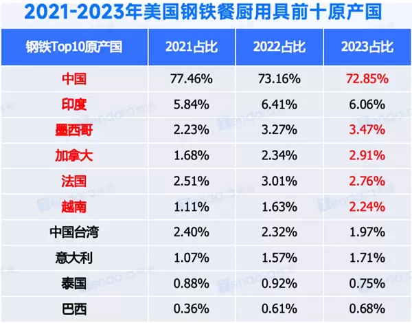 在具体国家市场上,冷倩倩以美国为例进行了深入分析。她指出,“美国主流餐厨用具的进口趋势呈现出多元化和地缘化特点。虽然中国仍然是美国钢铁和陶瓷类餐厨用具的最大供应国,但其市场份额在逐步下降,而墨西哥、加拿大、印度等国家正在逐渐扩大市场份额。这表明美国在进口餐厨用具时,越来越注重地缘优势和成本优势。”