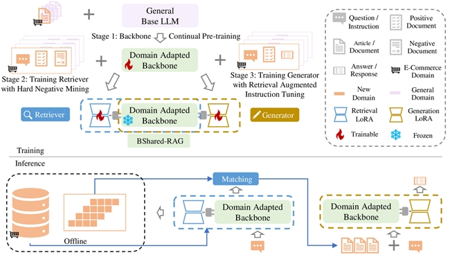 在具体训练过程中,研究人员首先使用领域特定的语料库对基础模型进行持续预训练,作为领域特定的基座模型;然后基于共享的基座模型训练两个即插即用的低秩适应(LoRA)模块,分别最小化检索和生成的损失。实验结果表明,BSharedRAG在两个数据集的检索评估中相较基线模型分别提升了5%和13%的Hit@3(检索内容前三位的推荐有效率)表现,并在电商问答领域对比基线模型提升了23%的文本生成质量等。