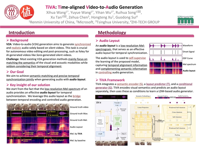 10月28日至11月1日,2024国际多媒体会议(ACM International Conference on Multimedia 2024,简称ACM MM 2024)在澳大利亚墨尔本举行。中国人民大学高瓴人工智能学院宋睿华团队代表王希华受邀进行口头报告,分享了和值得买科技联合开展的多模态领域研究成果《TiVA:时序同步的视频到音频生成》(TiVA:Time-aligned Video-to-Audio Generation),详细阐释了TiVA研究过程、框架及实现路径,并指出该项研究为当下多模态领域视频到音频同步生成的技术难题提供了一套高效解决方案,提升了AIGC内容生成方面的速度、质量和智能化水平。
