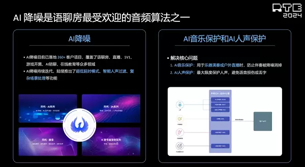 出海方面,所有场景几乎都在高速增长。具体来看,语聊仍是主线,月均时长占比89%,在中东和东南亚两大热门出海市场都有着不错的增长。在技术方面,AI降噪是声网今年最着重解决的问题,而且在传统的降噪之外,声网还扩展了AI音乐保护和AI人声保护等功能,可以更加精准地区分音频内容,保证直播质量不因降噪等技术处理而出现瑕疵。