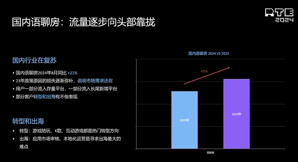 国内方面,去年由于政策及其他客观因素影响,泛娱乐产品“遇冷”,今年春节过后,整体市场开始回暖,增长喜人。尤其是语聊赛道2024年同比增长了21%,是增速较快的赛道。除此之外,语聊赛道在产品玩法上也看到了一些创新和转型,其中包括对AI角色的使用,K歌玩法广泛普及,以及音质和更多系统的适配。在这些层面,声网今年做了很多的努力。