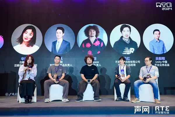 在会议的最后,白鲸出海泛娱乐方向特约顾问辛童,与声网音频娱乐产品负责人杨帆、Unity平台业务总监吴毅敏、inSpaze项目负责人易明、以及芒果融创产品技术总经理吴红,一起讨论了AI在泛娱乐,以及各领域的落地实践。