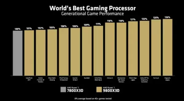 9800X3D确实专注于游戏性能。AMD称其为全球最佳游戏处理器,并承诺其平均FPS比7800X3D提升8%。这些提升得益于Zen 5架构和第二代3D V-Cache技术。