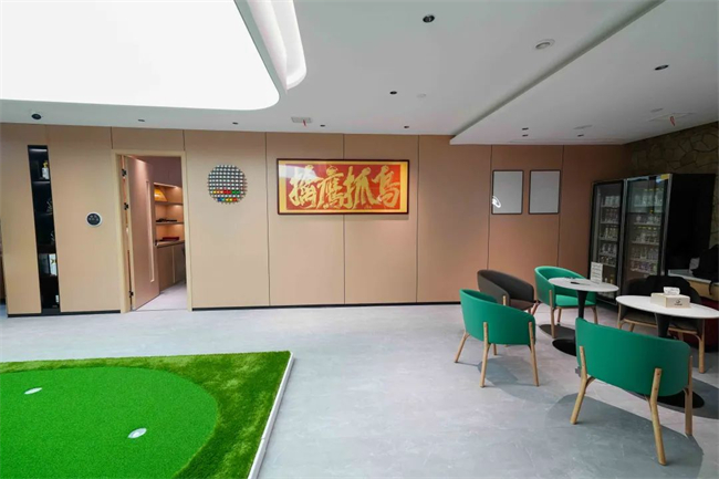 走进球馆,两个联排档位和两个VIP打球包厢映入眼帘,为不同需求的顾客提供了私密而舒适的打球环境。此外,球馆还配备了一个练习果岭和一个多功能会员活动室,满足了学员练习、社交的多元化需求。