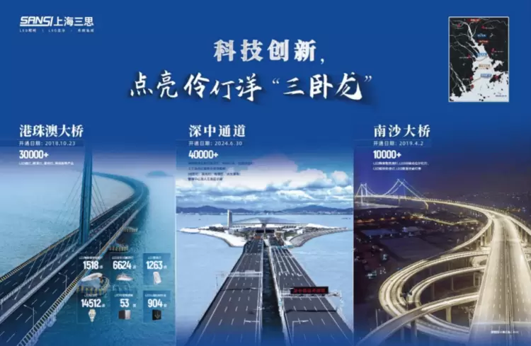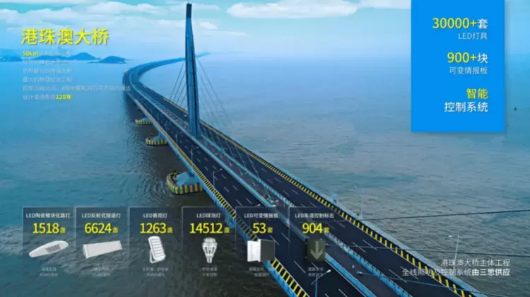 港珠澳大桥是一项由“桥—岛—隧”一体化组合的世界超级工程,桥上所有的LED路灯、LED隧道灯、LED可变情报板、LED景观照明灯、LED检修照明灯和LED可变信息情报板30000+套均由上海三思提供,这是中国乃至全球LED产品应用量较大的单项超级工程之一。